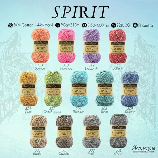 Scheepjes Spirit is een zacht en subtiel gekleurd garen dat is geïnspireerd door en vernoemd naar diverse Spirit Animals. Scheepjes Spirit is gemaakt van 56% katoen en 44% acryl, voelt zijdezacht aan, heeft een natuurlijke uitstraling en is toch heerlijk warm. Met dit subtiel gemêleerde garen haakt of breit u de prachtigste dekens, truien, vesten of omslagdoeken. Een bol Scheepjes Spirit weegt 50 gram en heeft een looplengte van 210 meter (garendikte Fingering). De aanbevolen naalddikte is 3.50-4.00mm. Geleverd per 1 bol.